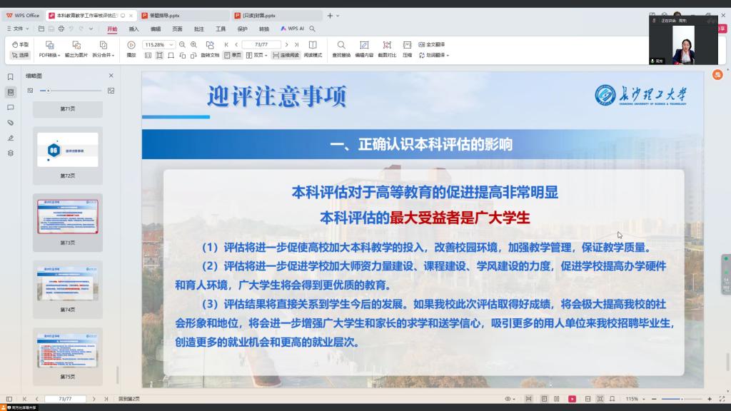 周芳部署本科教育教学审核评估工作有关工作,领学《本科教育教学审核评估应知应会(学生版)》,向与会老师强调审核评估工作的重要性。她指出,要在学院学生群体中营造良好的迎评氛围,贯彻落实“以评促建、以评促改、以评促管、以评促强”的方针,以主题班会、抢答赛等为契机,增强学生参与本科教育教学审核评估工作的责任感和使命感。