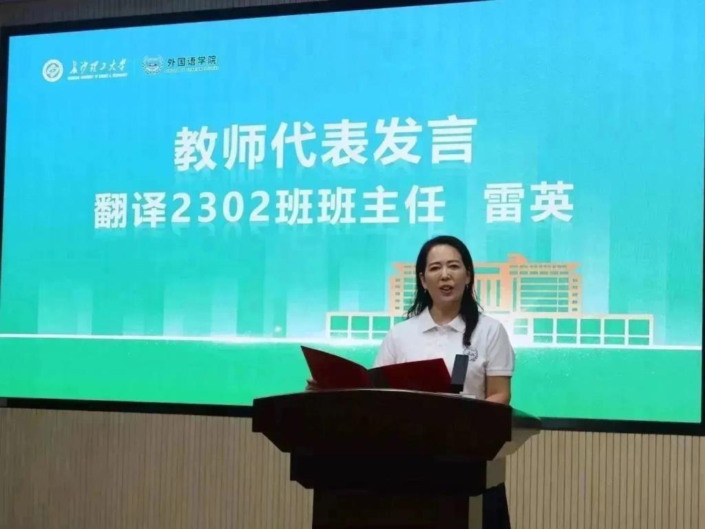 教师代表、翻译2302班班主任雷英老师发言,她指出大学是充满挑战和机遇的,希望同学们能够积极参与到校园生活中,强调要学会平衡学习和生活、注重团队合作、勇于尝试和创造。