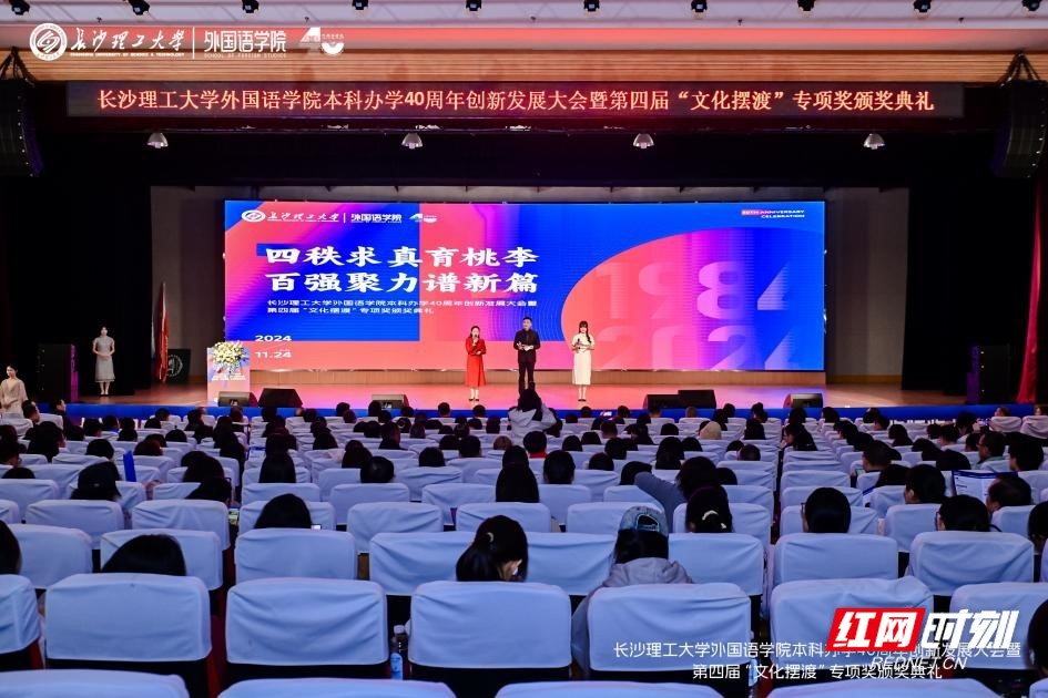11月24日,437必赢会员中心外国语学院在金盆岭校区举办本科办学40周年创新发展大会暨第四届“文化摆渡”专项奖颁奖典礼,以外语之名携手前行,拥抱未来。
