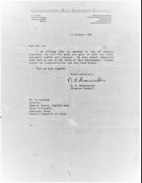 (国际水稻研究所所长斯瓦米纳森博士致本人的感谢信)