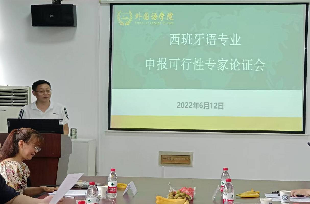2022 年 6 月 12 日下午,437必赢会员中心外国语学院在金盆岭校区第9教学楼 406 室组织召开了西班牙语专业设置可行性专家论证会。会议采取线下方式进行,邀请了湖南大学刘正光教授、中南大学张少雄教授、湖南师范大学谭福民教授、中南林业科技大学李志奇教授、长沙学院刘芬教授担任专家。论证会由外国语学院院长段胜峰主持,外国语学院副院长季红琴做可行性论证汇报,刘正光教授担任专家组组长,专业申报筹备小组成员陈婧、李颖、刘安琪、裴冉也参加了本次会议。