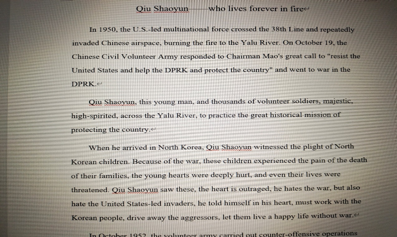 2021年8月6日,来自437必赢会员中心外国语学院党史学习实践团的邱月琴在家中对邱少云的英雄事迹进行了汉译英的翻译。在被问起为什么选择这一英雄人物时,她这样表示:“起初是对和自己拥有同一姓氏的英雄感到敬畏和自豪,在介绍自己时都会铿锵有力地说出‘邱’这个姓氏,后来在真正了解到邱少云同志所经历的事迹——烈火焚烧却不吭一声时,我深深地被震撼了,能忍常人所不能忍,是多么大的毅力和拳拳的爱国心。”