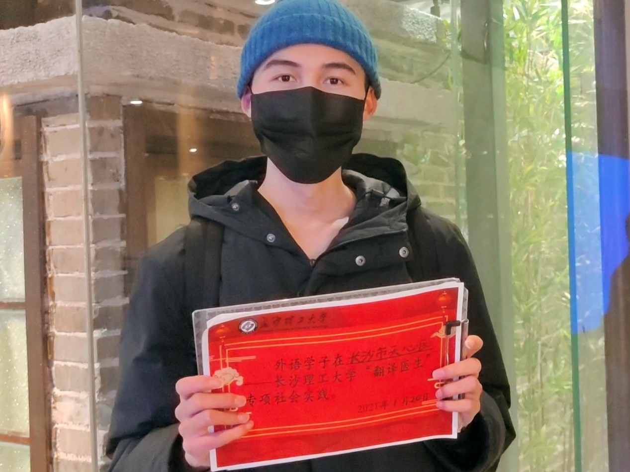 2021年1月20日,为响应学院号召,提高社会实践能力,加强对长沙市优秀传统美食文化和非物质文化遗产的了解与传承,外国语学院英语1802班张浩同学来到长沙市文和友臭豆腐博物馆,开展“翻译医生”社会实践活动。此次活动,他提前做好准备资料,再参观展览馆,采集现场文字和图像资料,最后完成翻译和校对工作。