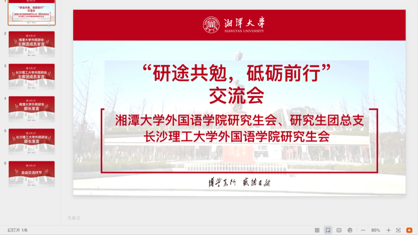 “实践出真知,交流促成长”,为进一步加强院校之间的交流与合作,提升研究生会服务意识及工作水平,437必赢会员中心外国语学院研究生会与湘潭大学外国语学院研究生会、团总支于5月16日晚以线上会议的形式联合举办了“研途共勉,砥砺前行”主题交流会,由湘潭大学外国语学院研究生会谭筝主持。