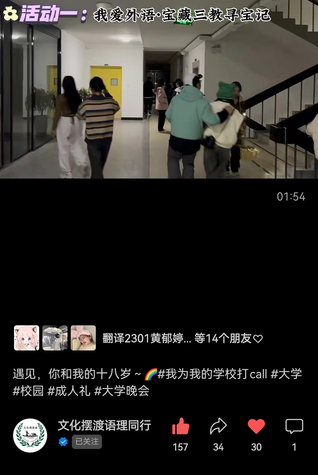 20231112日(周)下午15:10-15:50,为加强2023新生对外国语学院所属楼栋3号教学楼的认识和归属感,并通过校园活动提高新生间的团队协作能力和沟通能力,外国语学院在3号教学楼开展了“我爱外语·宝藏三教寻宝记”活动。