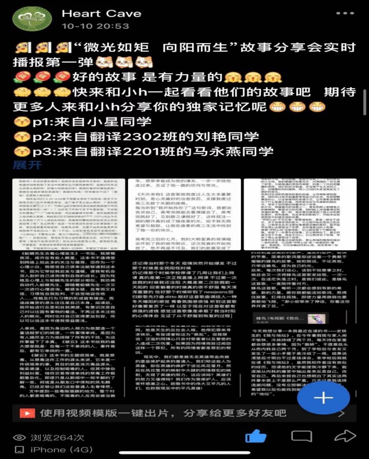 为加深外院学子对世界精神卫生日的了解,呵护同学们的心理健康,鼓励同学们增强自我关怀,帮助同学们寻找适合自己的纾解情绪的方法,2023年10月10日至2023年10月12日我院朋辈心理互助部开展了“微光如炬,向阳而生”故事分享会活动,本次活动共分为10月10日于3教611进行的线下“情绪留言板”情感共鸣活动和10月10日-10月12日在官q开展的线上“心灵树洞”故事分享活动两个部分。