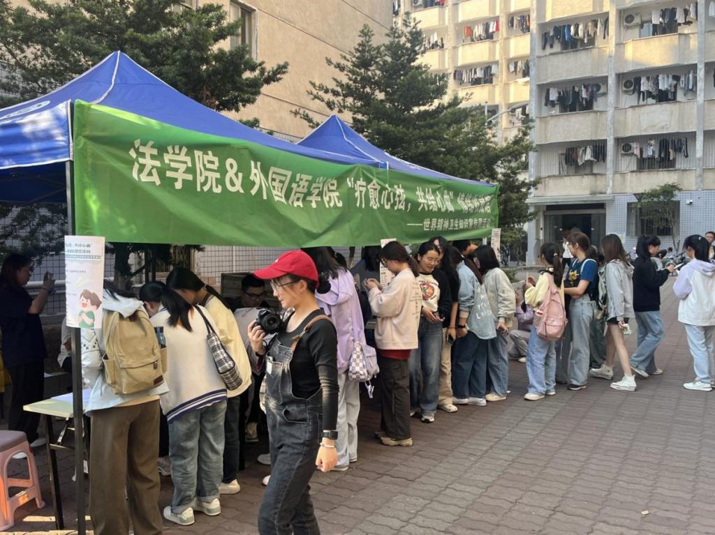 时逢第32个世界精神卫生日,为了帮助同学们正确释放压力和进行自我认知,外国语学院与法学院于2023年10月24日16:00—17:30在金盆岭校区西苑食堂前坪开展了疗愈心弦,共绘心曲”情绪收藏馆活动,共同致力于为同学们提供一个情绪倾诉的平台。大家参与热情高涨,共计155名到现场参与此次活动,其中包括外国语学院的69名同学以及法学院的86名同学。