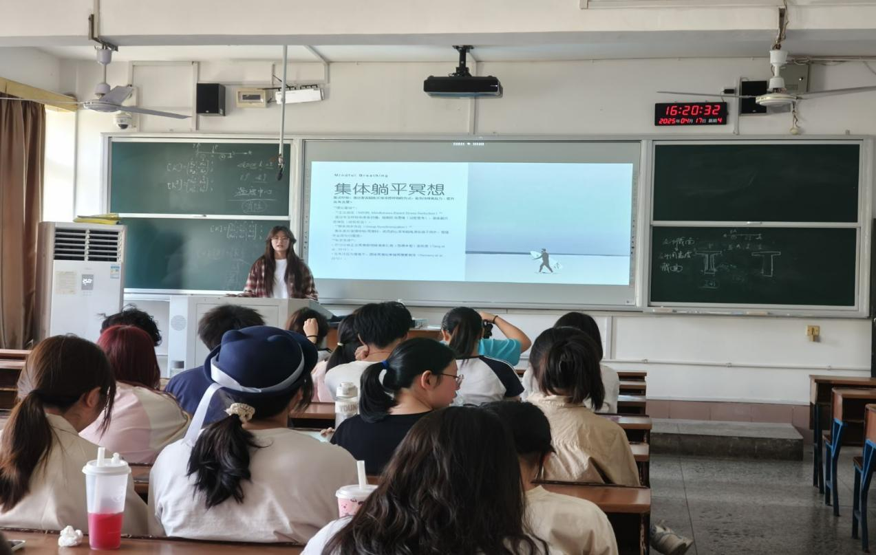 活动期间各班级结合自身特色设计了别出心裁的活动内容:英语2401班心理委员带领同学们进行“集体躺平冥想”练习,通过舒缓的音乐和引导语帮助大家放松身心;英语2402班则通过“接力画画”“默契作答”等互动小游戏鼓励同学们敞开心扉,让同学们在欢声笑语中释放压力;英语2403班以“压力吐槽大会”形式鼓励同学们敞开心扉,分享入学以来的困扰,并由心理委员科普压力管理技巧……活动尾声,同学们纷纷表示收获颇丰,不仅掌握了实用的减压方法,更感受到集体的温暖与支持。