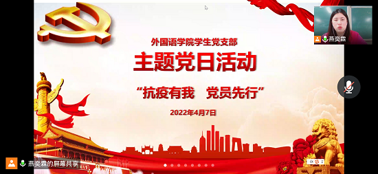 4月7日晚,学院本科生翻译党支部和英语党支部共同于线上开展“抗疫有我 党员先行”主题党日活动,对近期支部参与的战疫志愿活动进行总结。本次活动由英语党支部党建宣传组组长燕奕霖主持,党建辅导员毛婕老师及党支部全体党员参加。
