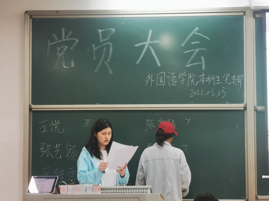 左悦等6名同志依次进行竞选发言,与会党员进行匿名投票,最终确定左悦,张艺颖,厉佳雪担任本科生英语党支部委员,陈宇倩,夏容容,冯雨霁担任本科生翻译党支部委员。
