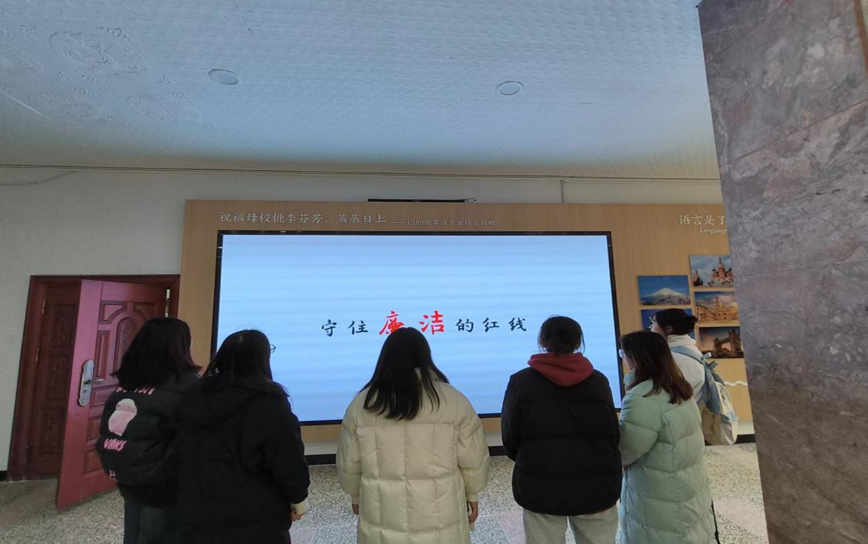 为加强廉洁教育,提高学生们的廉洁意识,437必赢会员中心外国语学院于12月12日下午在三号教学楼一楼大厅举行廉洁文化作品鉴赏展览。一楼大屏对优秀廉洁文化宣传视频等相关材料进行轮播展示,让学生们更加深入了解廉洁文化的内涵及其价值。