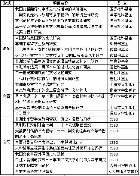 近年来,主持国家社科基金5项,主持教育部基金4项,主持省社科基金20余项,主持省社科联基金1项,主持省教育厅基金8项。出版专著、译著、编著共12部;发表论文100余篇,其中CSSCI收录论文30余篇, 人大资料全文转载3篇。经过多年积累,非洲中心已经形成了比较稳定的研究方向:中国文化走出去战略研究、非洲来华留学生教育研究、非洲文学(戏剧文学和口头文学)研究、非洲孔子学院可持续发展战略研究、非洲英语研究等。相关课题与研究成果摘录如下: