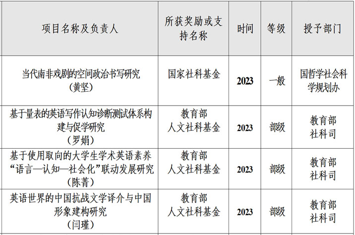 2023年9月16日,国家社科基金和教育部人文社科2023年项目立项名单公布,在本次申报中,我院黄坚教授获批国家社科一项,罗娟、陈菁、阎瑾副教授分别获批教育部人文社科项目立项,是我院取得历史最好成绩。四位教师均是国别与区域研究中心的骨干教师,其项目的同时获批有力推动了科研中心发展,同时激发了科研人员的信心。