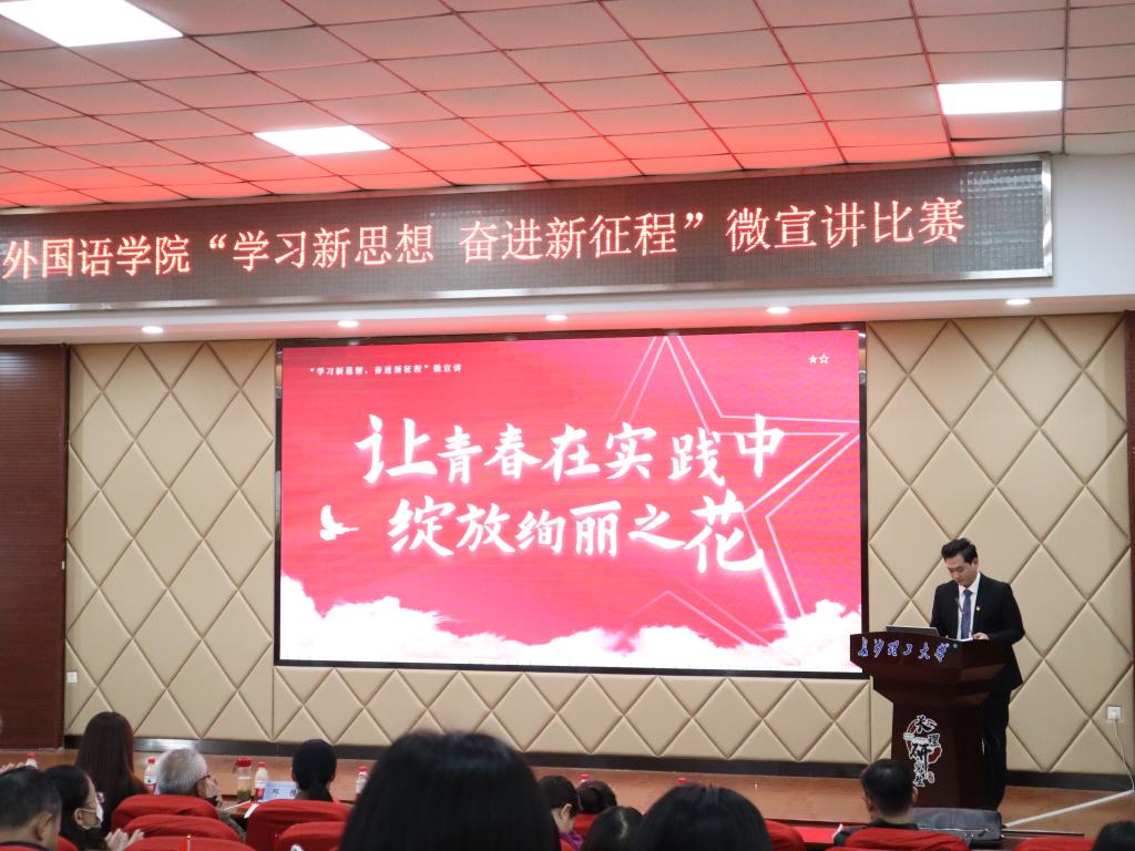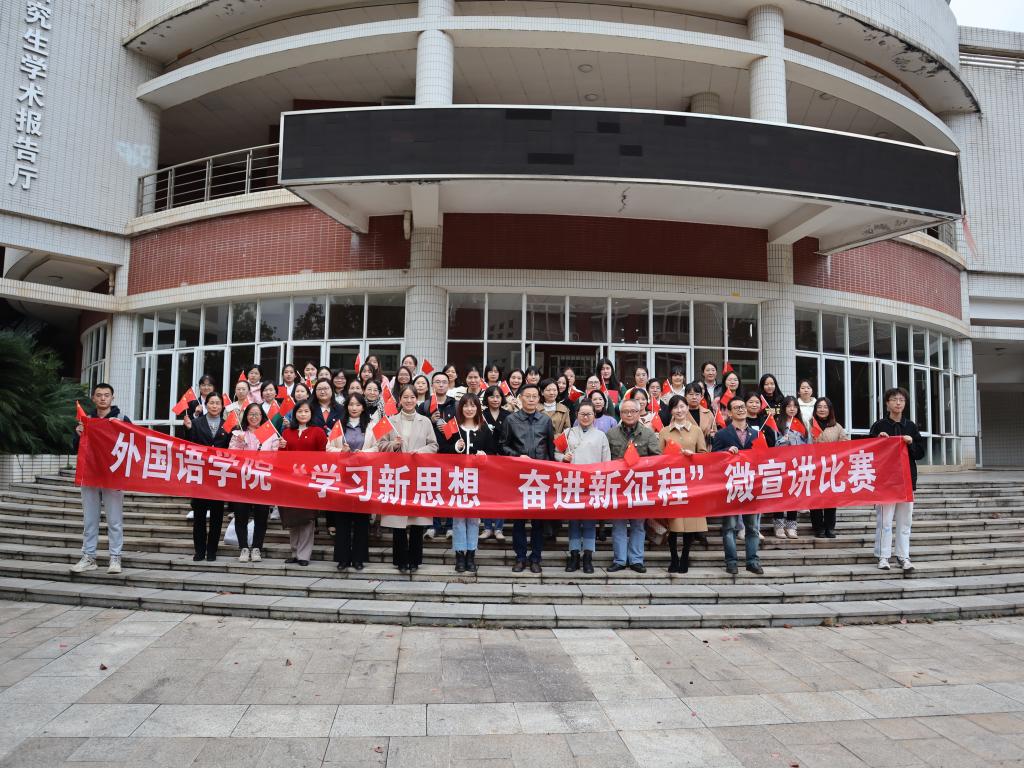 11月15日下午14:30,437必赢会员中心外国语学院在云塘校区文科楼A-200学术报告厅举办了“学习新思想,奋进新征程”主题微宣讲比赛。校工会常务副主席郭剑、党政办副主任喻玲、教务处副处长邓丰、党建组织员邓豫出席活动并担任评委,外国语学院全体师生党员热情参与。