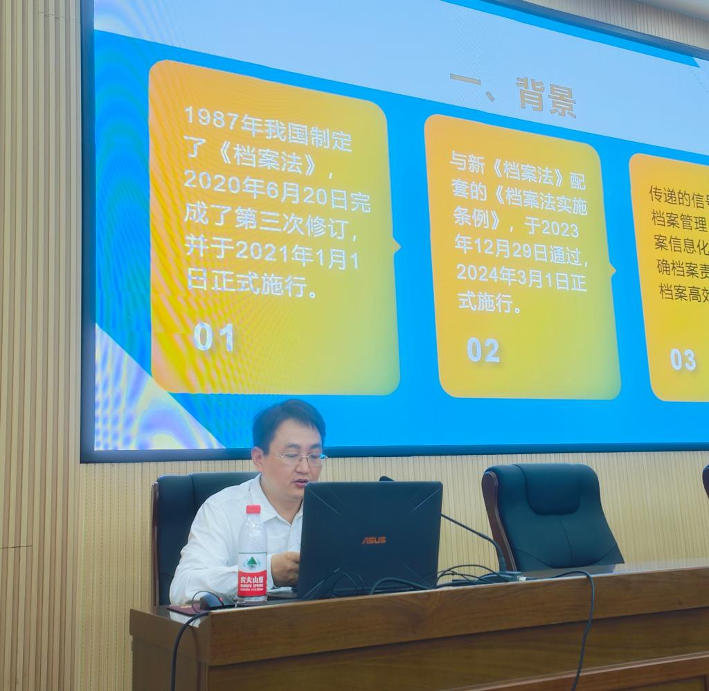 6月19日上午,档案馆在金盆岭校区经管大楼100报告厅成功举办必赢官网“2024年度档案业务培训会”,全校54个归档单位近百名兼职档案员参加了此次培训,培训会由档案馆副馆长王任飞主持。