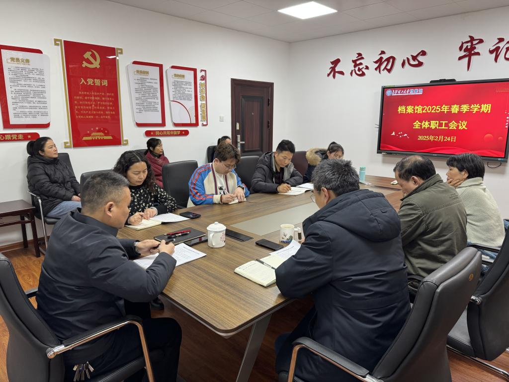 2月24日,档案馆召开2025年春季学期全体职工会议,会议由副馆长王任飞主持,档案馆全体职工参加。