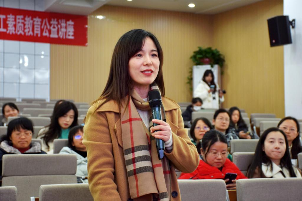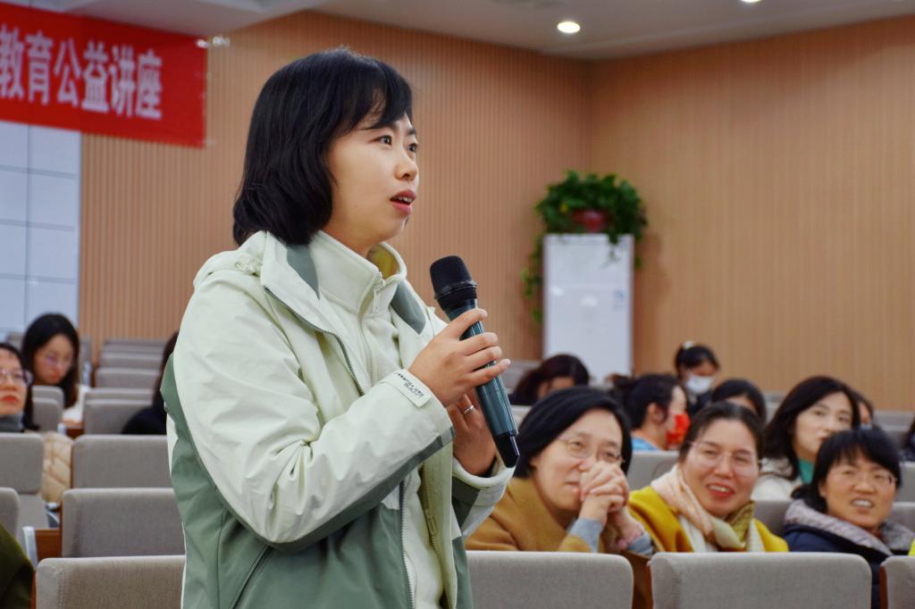 “父母是孩子的思想引领者,和孩子一起共同学习共同成长,做孩子的陪跑者,精神引领者,人生规划的共同制定者。”殷俊带来题为《家长给予孩子的有效引领》的讲座。她用自己引领女儿成长中的生动案例,从思想引领和情绪引领两个方面来分享自己对孩子的教育经验。在思想引领方面,要树立共同目标,制定规划来激励孩子积极的自我行动力;要针对孩子有的信息盲点,尽家长优势做到开阔视野,补充信息,给予实操性的信息收集和指引。在情绪引领方面,她认为“家长是孩子的陪跑者,陪伴和耐心沟通非常重要”“交流的态度和方法显得尤为重要”。她建议不追求站在家长角度一味地说教、贴标签,应观察理解小孩现在学习情绪和生活中兴趣爱好方面的状态,善于聆听,耐心了解他们心里的想法。