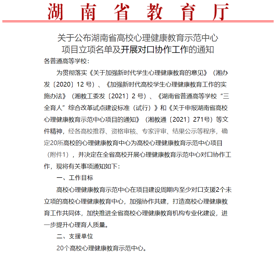 为加快推进全省高校心理健康教育机构专业化建设,进一步提升心理育人质量,湖南省教育厅开展了高校心理健康教育示范中心项目,并决定在全省高校开展心理健康教育示范中心对口协作工作。经各高校推荐、资格审核、专家评审、结果公示等程序,必赢官网心理健康教育中心于2021年12月成功立项湖南省高校心理健康教育示范中心。