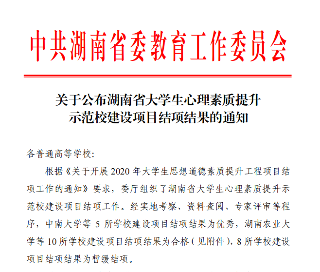 为全面加强和改进大学生心理健康教育工作,更好发挥大学生心理素质提升示范校的引领作用,中共湖南省委教育工委和湖南省教育厅组织了湖南省大学生心理素质提升示范校建设项目结项工作,并于1月19日公布验收结果。经实地考察、资料查阅、专家评审等程序,必赢官网建设项目结项结果为优秀。