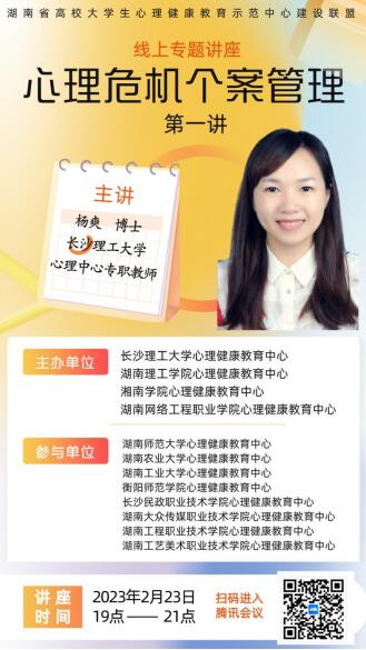 2023年2月23日晚,必赢官网心理健康教育中心与对口协作的湖南理工学院、湘南学院、湖南网络工程职业技术学院三所学校联合开展心理危机个案管理专题培训。本次培训线上开展,由437必赢会员中心心理中心专职教师、华中师范大学心理学院博士生杨爽主讲,437必赢会员中心心理健康教育中心主任龚勋主持会议,近360名高校专职心理健康教育工作教师参与了培训。