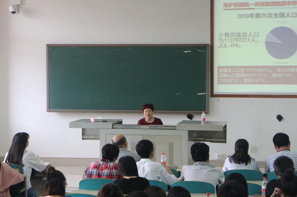 田慧从我国少数民族的分布和周边形势开始讲起,强调新疆和西藏在国家稳定发展中的重要作用。她从我国各民族的发展历史中呼吁大家牢记自己中华民族的身份,淡化少数民族标签,主动融入到大学生活中,与其它同学互相学习、互相尊重。特别是新疆的同学要分清宗教习惯与民族习俗的区别,防止泛清真化,看清三股势力的本来面目,主动发声亮剑,与三股势力划清界线。她强调,要珍惜自己在内地学习的机会,向优秀的学长学姐学习,成为学校的骄傲。