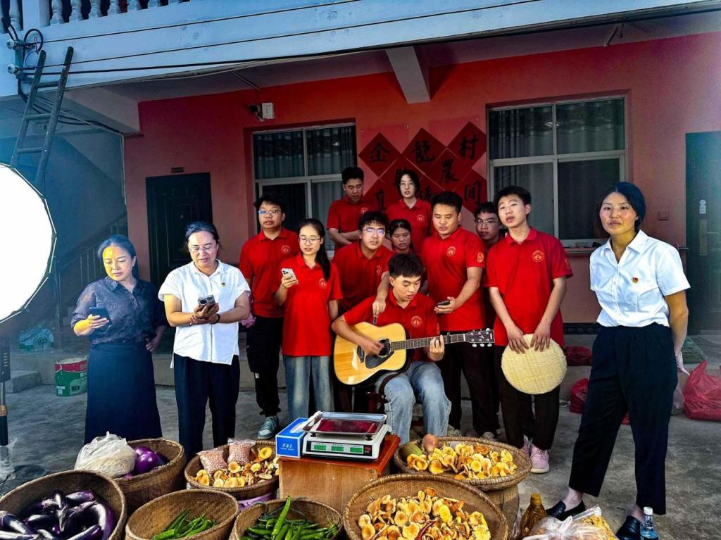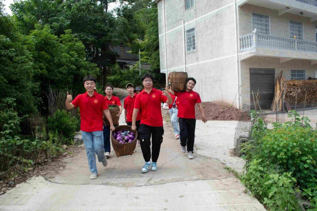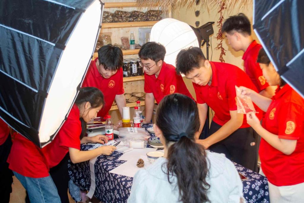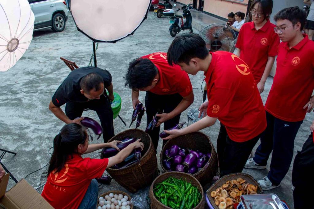 7月7日,“红烛”团队队员们用相机、打光灯、乡土道具,为当地的石耳、盐菜、土鸡蛋、干香菇等特色农产品拍摄直播链接宣传图,让藏在这座乡村的好食材通过镜头赋予直观鲜活的“视觉语言”。7月8日-10日,队员们穿梭于乡村的各个角落,设计动作、寻找角度、统筹规划,以创意转场视频为载体将乡村的美景“云宣传”,同时,一间一间走进乡村百姓家中询问需要出售的农产品,用镜头记录真实淳朴的“交易”,制作充满生活气息的直播预告短视频。每一帧画面,都是汗水与匠心在烈日下的淬炼,只为直播开始时那份源自生活、不打折扣的新鲜感。7月11日午后,他们与村民并肩,俯身弯腰在田地里仔细搜寻、小心采撷,镜头特写下,辣椒蒂上细小的绒毛在强光下清晰可见,全景框中,成堆的茄子在西斜的日光里泛着油润的紫色光晕。迎着骄阳,顶着烈日,都只为了将这份带着 “山野体温”和“阳光味道”的鲜度完美呈现。