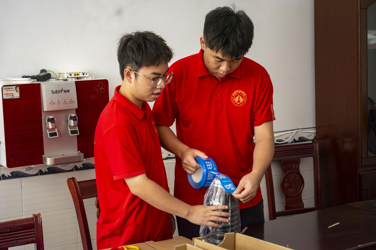 7月12日早晨,为了让新鲜的农产品稳稳“出村”,“红烛”队员们没有丝毫懈怠,立刻投入到热火朝天的“后方战场”。狭小的屋子里,堆满了带着泥土气息的有机农产品。大家围坐在一起,拣选所需农产、按订单分装、精准称重,闷热的空气里,只听得见包装材料的窸窣声和彼此鼓励的话语。汗水再次浸湿了衣衫,但没人停下。打包完毕后,同学们又化身“运输队”,肩扛手提,将一箱箱饱含期盼的包裹,小心装车,看着满载包裹的汽车驶向远方,大家才终于松了一口气,疲惫的脸上满是欣慰——这条从田间直达餐桌的“出山路”,终于由他们的汗水铺就。
