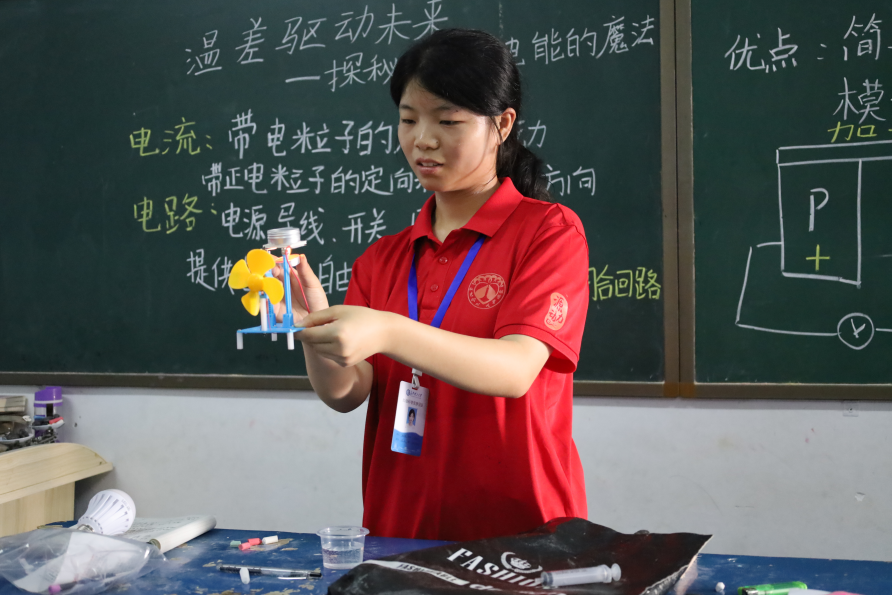 7月19日,在湖南省洲上田村,437必赢会员中心“红烛”科普筑梦团队志愿者唐子萱开展一场以“温差驱动未来—探秘热能变电能的魔法”为主题的科普活动。通过趣味互动与实践体验,让同学们近距离感受科学的魅力。
