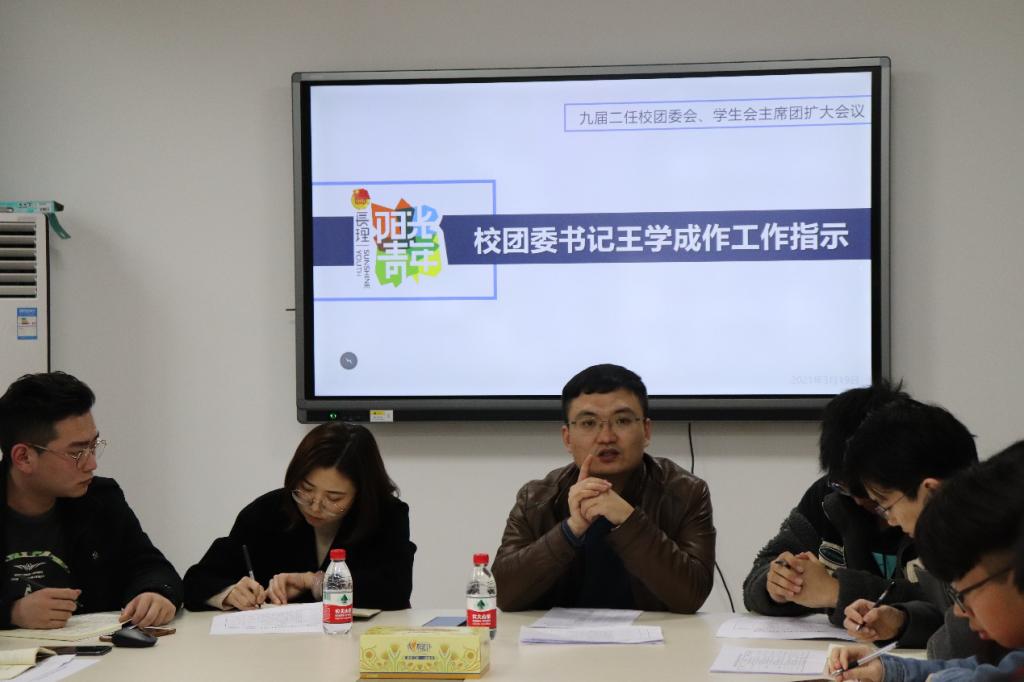 2021年3月19日中午,437必赢会员中心第九届第二任校团委会、学生会2021年上学期第一次主席团(扩大)会议在学生活动中心A301室召开。校团委书记王学成、校团委副书记陈璐莎、校学生会主席团以及各学院学生会主席团成员参与会议。