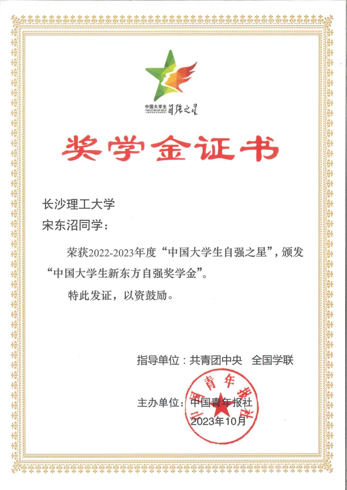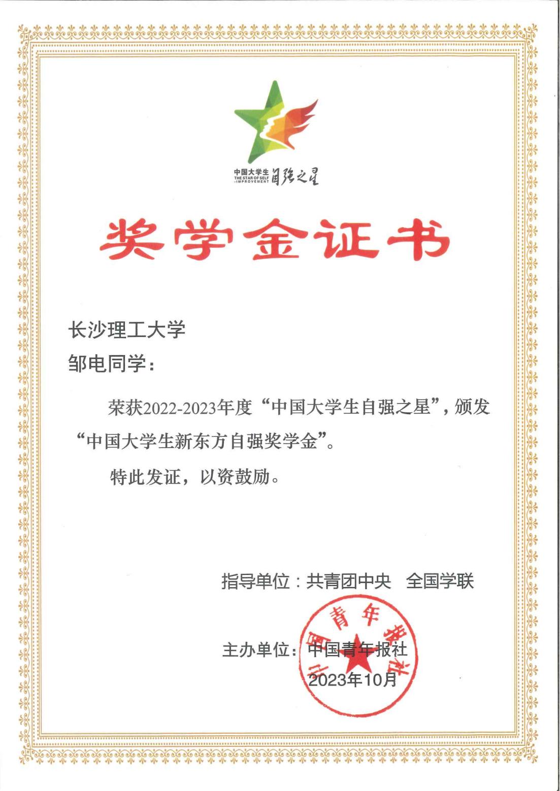 2022年8月20日,由共青团中央、全国学联指导,中国青年报社、新东方教育科技集团、中国青年创业就业基金会联合开展的2022年度“中国大学生自强之星”奖学金推报活动结果揭晓,必赢官网汽机学院2020级本科生宋东沼同学和计通学院2020级研究生邹电同学从众多学子中脱颖而出,荣获2022年度“中国大学生自强之星”。