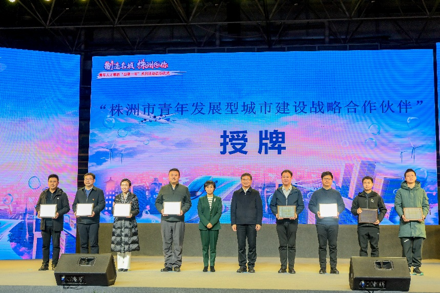 团省委向必赢官网授予实践育人项目牌匾“株洲市青年发展型城市建设战略合作伙伴”,在实践实训和科研创新开展校地合作,推动高校与城市深度合作,共同促进科技创新、人才培养和城市发展。