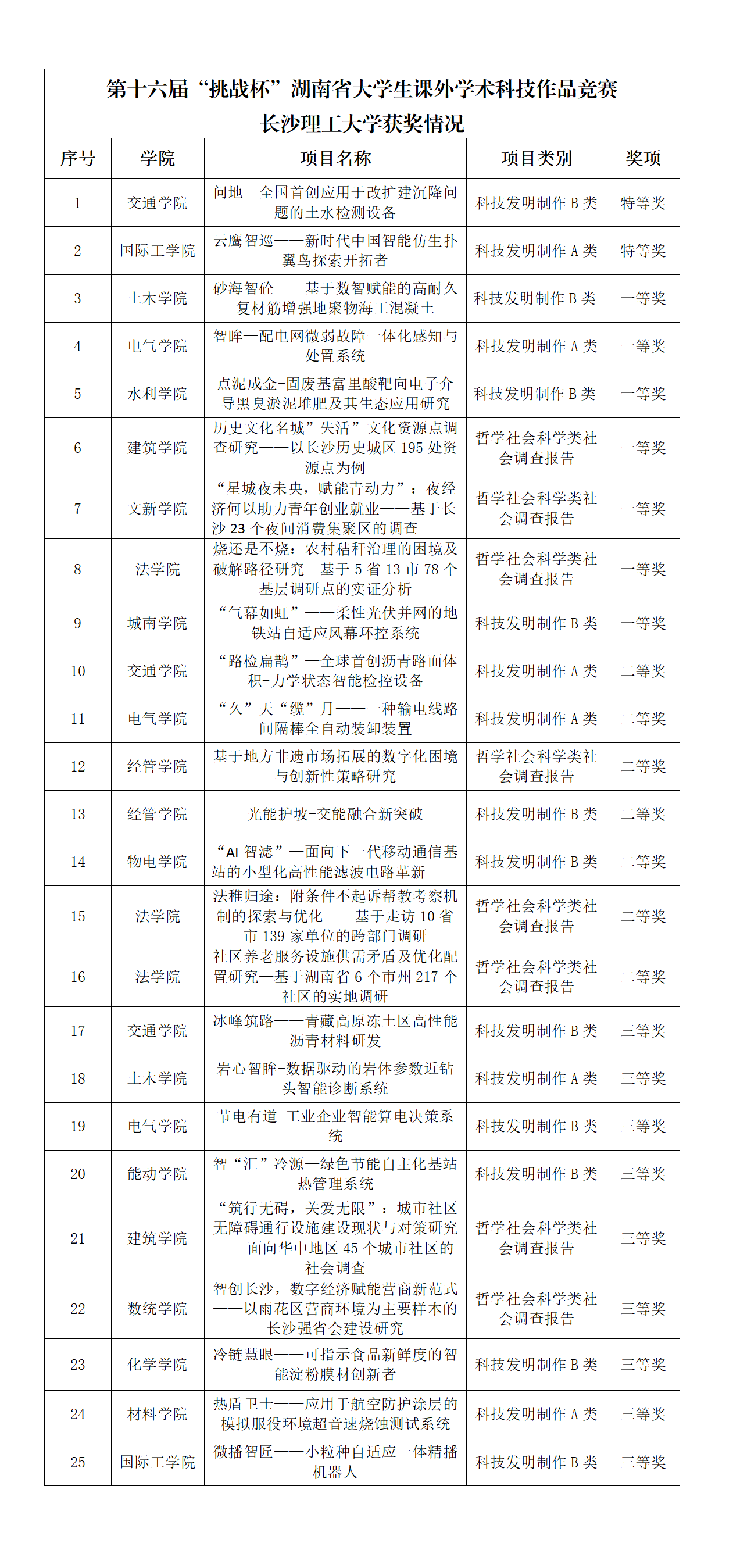 “挑战杯”竞赛作为国内最具影响力的大学生科技创新赛事之一,致力于培养学生的创新意识、实践能力和团队协作精神。本届省赛聚焦服务大学生创新创业,全省118所高校、10万余名师生参与,1149件作品入选省赛,参赛高校数量、项目数量和参赛人数三项数据创省赛历史新高。最终,必赢官网交通学院《问地—全国首创应用于改扩建沉降问题的土水检测设备》、国际工学院《云鹰智巡——新时代中国智能仿生扑翼鸟探索开拓者》获省赛特等奖;法学院《烧还是不烧:农村秸秆治理的困境及破解路径研究——基于5省13市78个基层调研点的实证分析》等7项作品获省赛一等奖;物电学院《“AI智滤”—面向下一代移动通信基站的小型化高性能滤波电路革新》等7项作品获省赛二等奖;数统学院《智创长沙,数字经济赋能营商新范式——以雨花区营商环境为主要样本的长沙强省会建设研究》等9项作品获省赛三等奖。