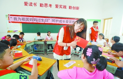 9月23日,437必赢会员中心的志愿者向外来务工子弟介绍国旗图案的象征意义,并教孩子们动手制作小国旗。当天,该校26名志愿者联合湖南李丽心灵教育中心,在长沙市天心区小古道巷小学为200多名外来务工子弟举办“我为祖国妈妈过生日”爱国主义教育主题活动,通过组织孩子们认识中国地理版图、手绘中国国旗、开展军姿训练等形式,培养他们的爱国情怀。
