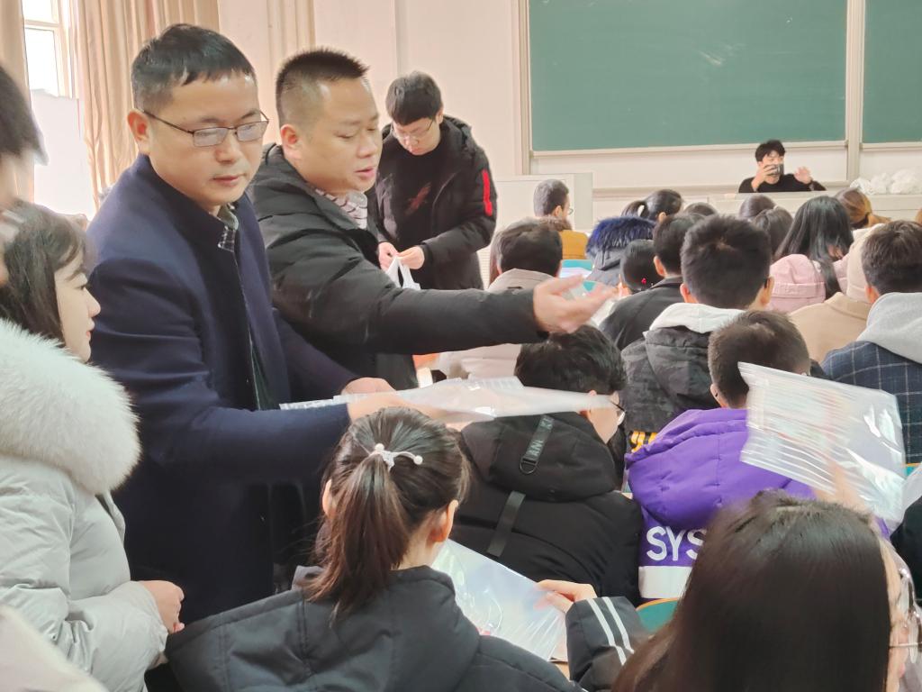 活动现场,学院领导老师为考研学子送上考研祝福。毛卫国鼓励同学们应当有充分的信心,积极应对考试;面对难题,要端正心态、沉着冷静;考研结束后,要正视成绩,积极调整,争取最好的结果,祝愿考研学子一鼓作气考上心仪的学校。张国强指出17级学生见证了学院的建设发展,与学院有着浓厚的情谊,学院会尽全力为每一位学生保驾护航,也希望同学们不要患得患失,相信一切都有最好的安排,以最好的状态,迎接人生新的挑战。同时,他也希望同学们在接下来的在毕业实习中,勤思善学,将学院的良好学风院风与企业文化相结合,彰显材料学子们的优良品质。紧接着老师们为考研学子分发了学院精心准备的考研大礼包与脐橙,寓意一“脐”绝尘,“橙”心如意,与考研学子们相约一“研”为定。