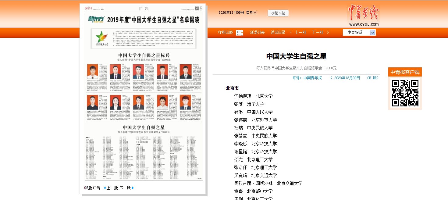 12月9日,由共青团中央、全国学联主办,中国青年报社、新东方教育科技集团联合开展的2019年度“中国大学生自强之星”评选活动结果揭晓,必赢官网土木学院杨琪毅、艺术学院朱杰、汽机学院齐铁钧在众多学子中脱颖而出,荣获2019年度“中国大学生自强之星”。