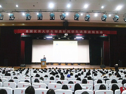 10月16日下午,全国优秀大学生邹勇松同学先进事迹报告会在金盆岭校区五教大礼堂举行。副校长谈传生,校党委委员、宣传部部长方琼,学工部(处)负责人和相关学院学生工作负责人及千余名2018级新生参加。