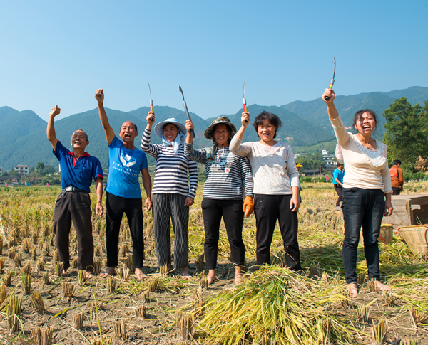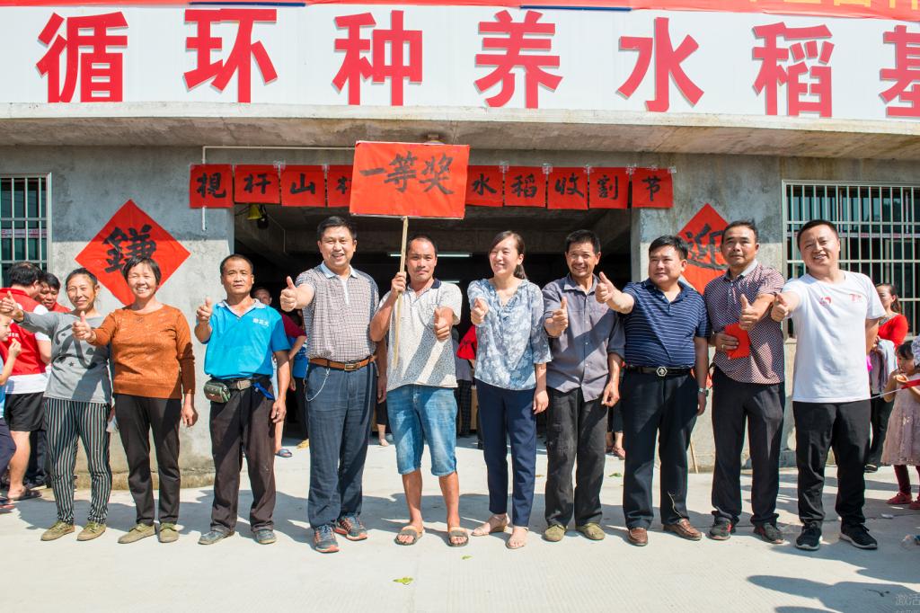 之后,村民们开启了热火朝天的劳动比赛。在收割水稻比赛环节,随着裁判的一声哨响,各队村民迅速地挥舞着手中的镰刀,娴熟地收割着水稻,用最原始的方式打稻谷。在这个环节,各队需要在0.2亩稻田里完成收割、打稻谷、装袋等全部工作,以完成的时间长短计算成绩。最终,来自7、8、9组的3队以7分9秒的成绩获得了比赛第一。