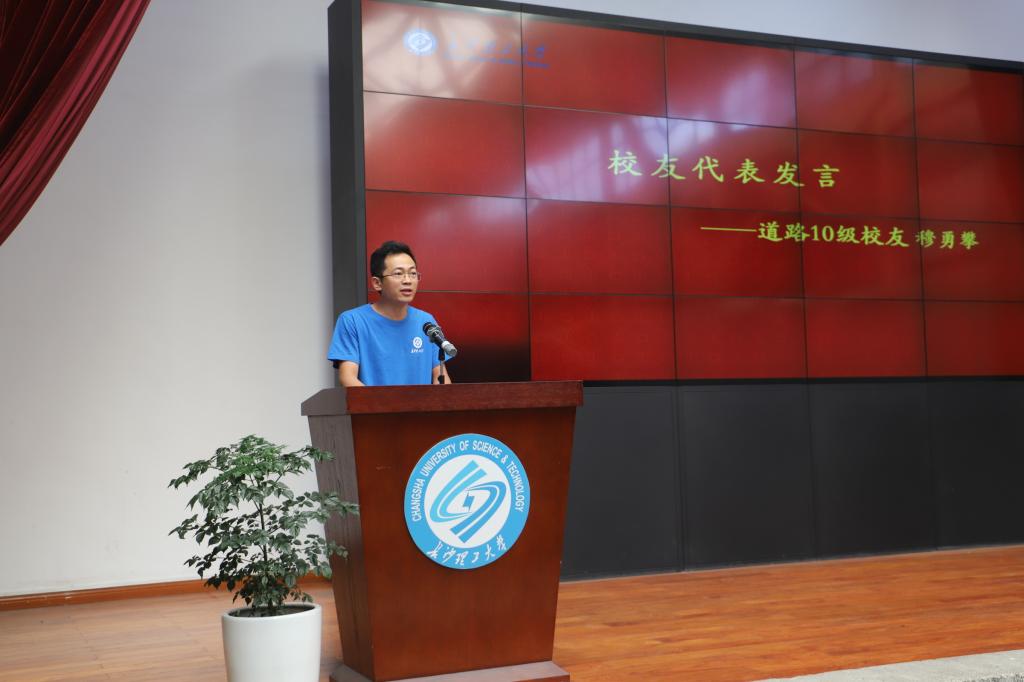 校友代表、必赢官网道路与铁道工程10级研究生、河南省交通规划设计院股份有限公司湖南区域经理穆勇攀寄语学弟学妹们要常怀感恩之心,笑对困难与挑战,继续学习,不断完善自己。