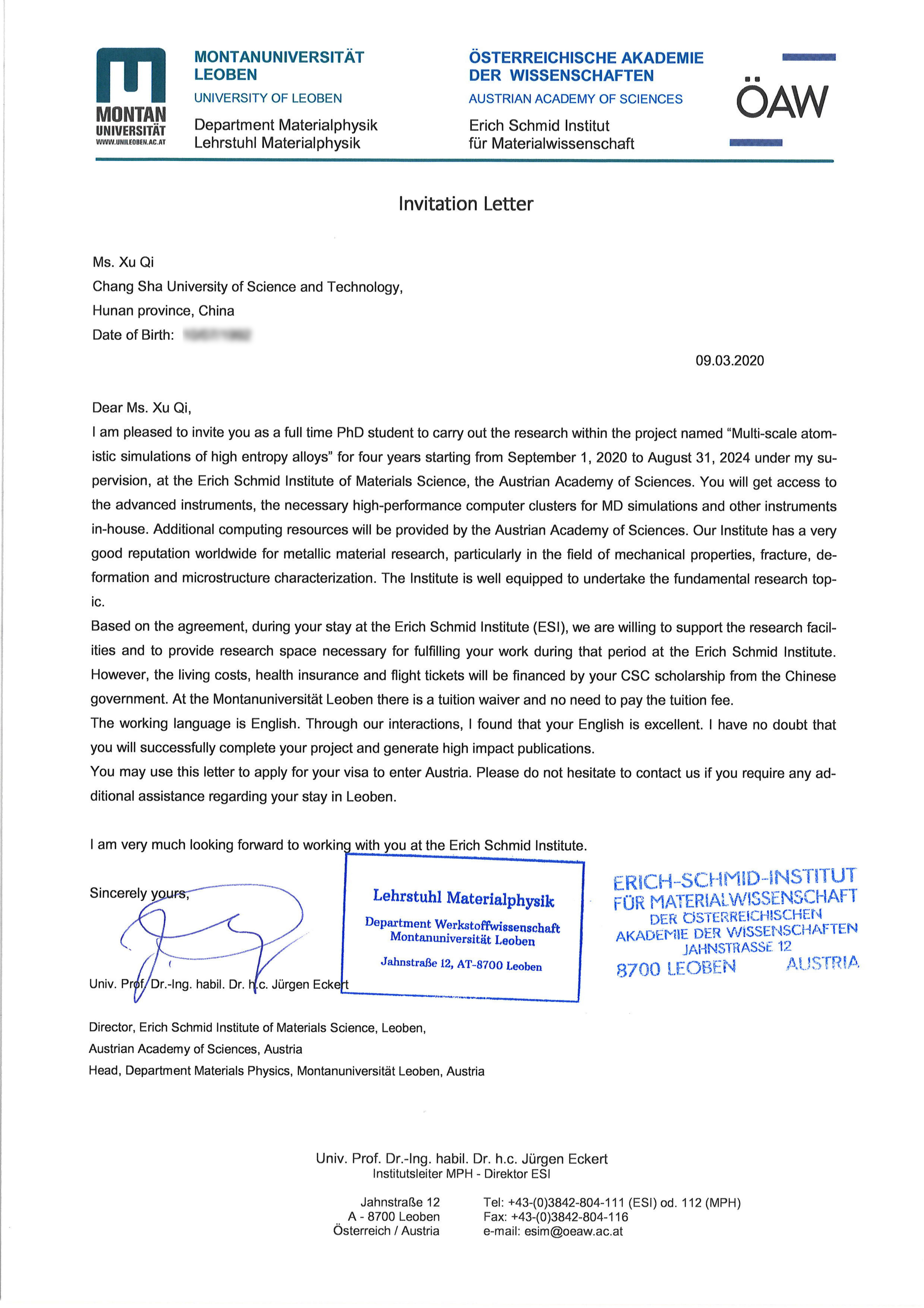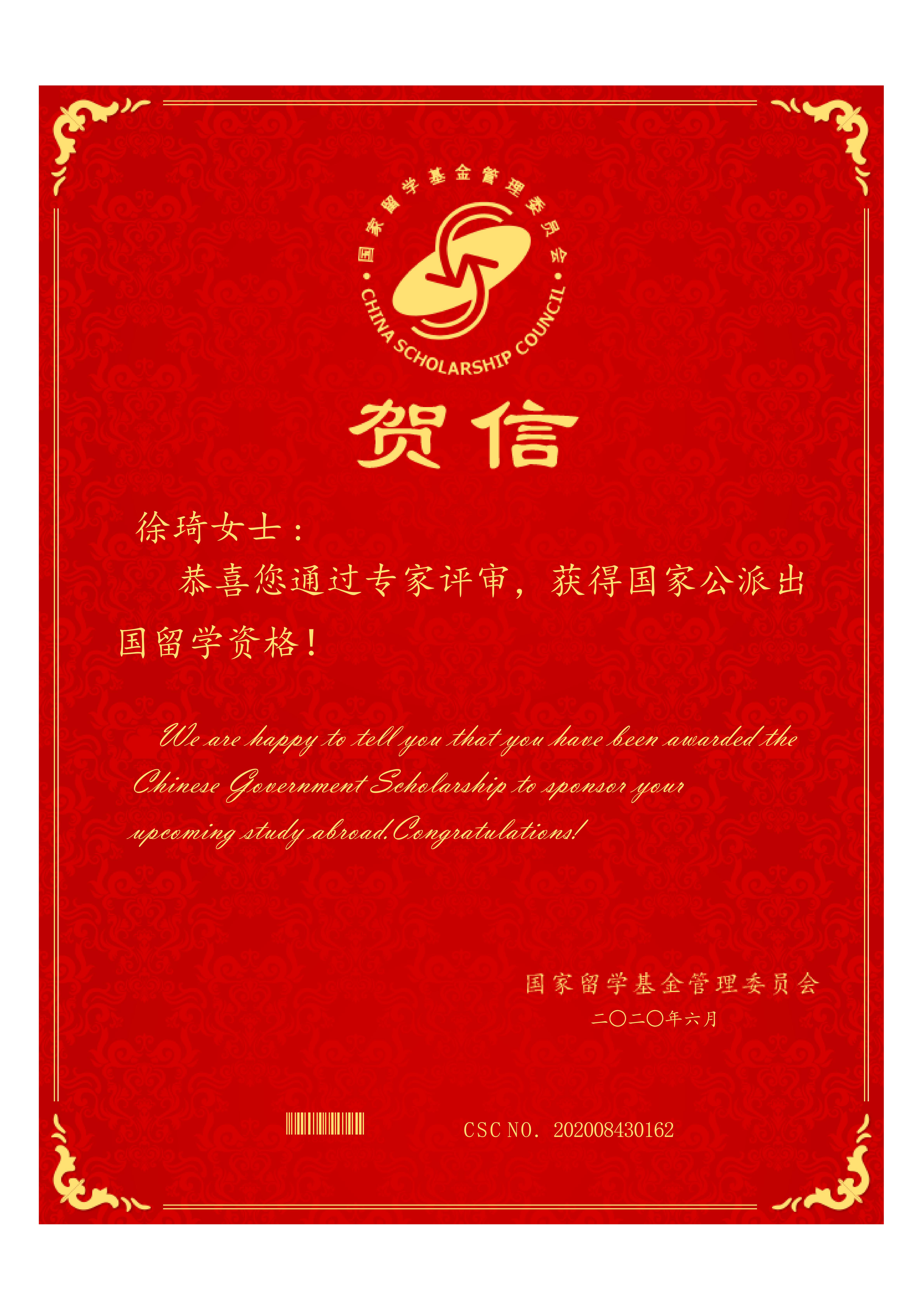 日前,国家留学基金管理委员会(以下简称“国家留学基金委”)公布了2020年度国家公派留学项目录取结果,必赢官网汽车与机械工程学院2020届硕士毕业生徐琦成功通过国家留学基金委专家评审,获得2020年国家建设高水平大学公派研究生项目资格,将赴奥地利科学院攻读博士学位。