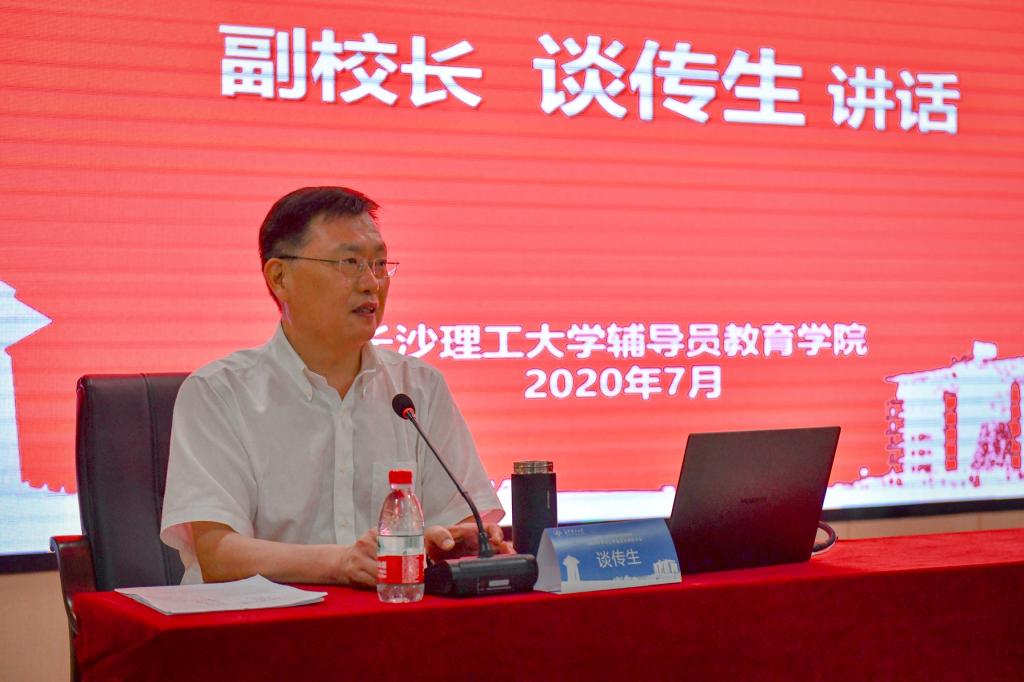 谈传生对近年来学生工作取得的成绩进行了肯定,从学工干部要力戒形式主义,做到信念坚定、保持定力、表里如一;要创新大学生思想政治教育的理念和方法;要落实立德树人根本任务,践行三全育人,要解决学生的信念问题,深刻理解立德树人和“三全育人”的内涵,要把握全员、全程、全方位的关键;要构建科学合理的机制体制,用好主渠道、主力军等方面阐述了如何推动学生工作内涵发展。