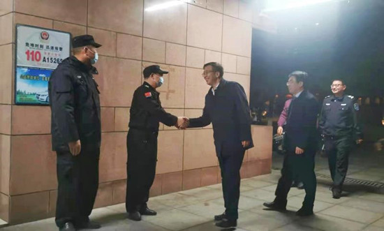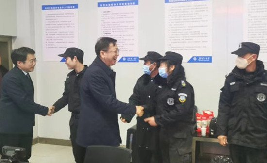 2月11日除夕夜,付宏渊一行先后看望了金盆岭校区和云塘校区各门岗、校园“110”、视频监控中心等值班安保人员。每到一处,他与安保人员一一握手,了解了他们假期工作和生活情况。在监控中心,他通过视频连线,认真检查了校园各处安保情况。座谈会上,付宏渊代表学校给坚守岗位的教职工送上了新春祝福,他表示,一线工作人员舍小家为大家,为学校的和谐稳定付出了辛勤劳动,为广大师生过一个安定祥和的春节做出了积极的贡献。