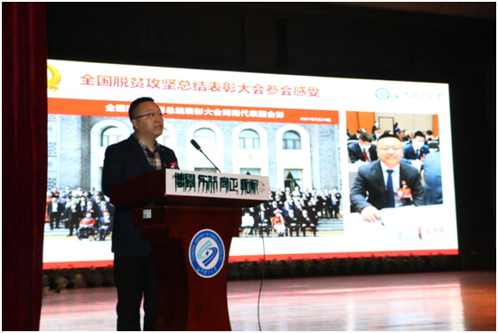 两个小时里,宋刘斌分享了自己在全国脱贫攻坚表彰大会上的感受以及在扶贫一线三年经历。从成立党员志愿服务队,修建贵王桥和5组通护路,到投入资金建设易地扶贫搬迁安置点、动员全校师生“带货”帮售农产品,在宋刘斌的讲述中,学生仿佛置身于枧杆山村的三年峥嵘岁月,亲历见证了山村的蜕变新生,也深切领会了打赢脱贫攻坚战对于中国乃至世界的重大意义,对党的政策的科学惠民性、国家制度的优越先进性,有了深刻的理解和认识。