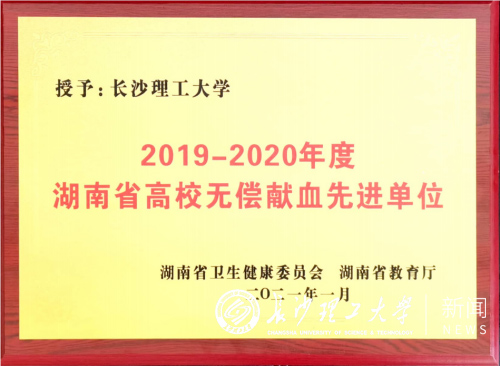近日,驻长高等院校无偿献血表彰会议在湖南宾馆召开,学校被湖南省卫生健康委员会、湖南省教育厅评为“2019-2020年度湖南省高校无偿献血先进单位”,被长沙市献血促进委员会评为“2020年度无偿献血先进高校”。