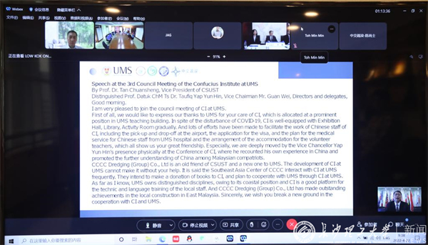 4月22日上午9点30分,沙巴大学孔子学院第三届理事会会议在线上举行,孔子学院三方暨全体理事会成员参加了会议。437必赢会员中心副校长谈传生、沙巴大学校长拿督Taufiq Yap Yun Hin教授和中交疏浚集团副总裁关巍先生出席并致辞。