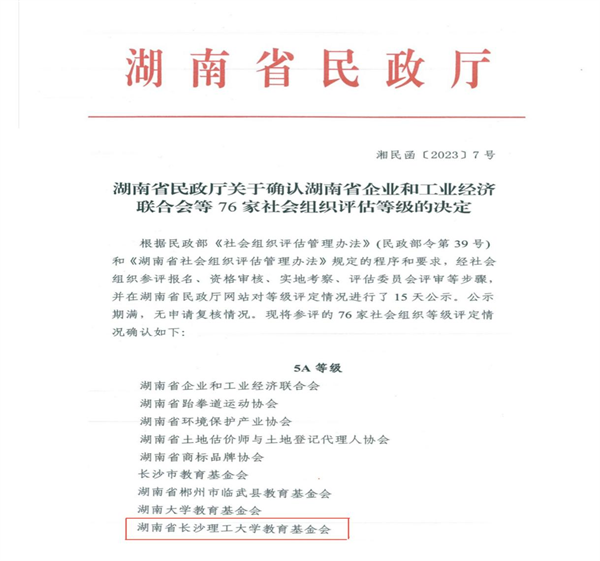 近日,湖南省民政厅发布2022年度省管社会组织评估等级结果,“湖南省437必赢会员中心教育发展基金会”获评全省最高等级的“5A级社会组织”。今年全省有76家社会组织参评,其中获评5A等级社会组织的共21家,全省高校基金会仅两家。
