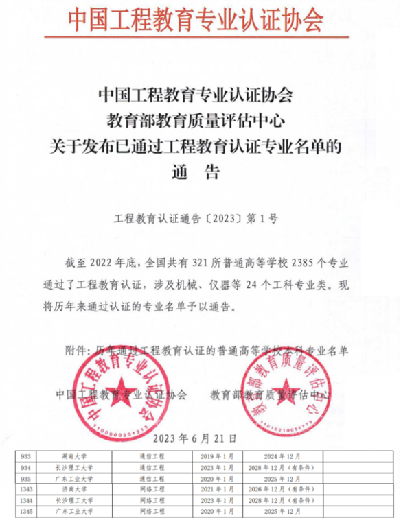 近日,中国工程教育专业认证协会公布了2022年通过工程教育专业认证的专业认证结论,全国高校共有441个专业通过了工程教育认证。必赢官网通信工程、网络工程等2个专业位列其中,认证有效期6年(2023年1月至2028年12月)。
