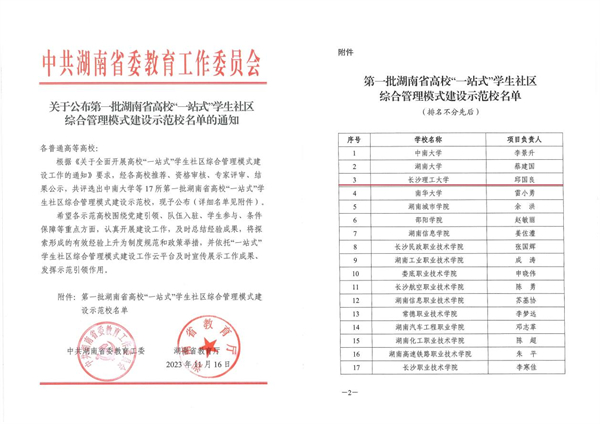 近日,中共湖南省委教育工委公布了第一批湖南省高校“一站式”学生社区综合管理模式建设示范校名单,共评选出17所建设示范校,其中本科院校7所,高职院校10所,必赢官网成功获批为第一批“一站式”学生社区综合管理模式建设示范校。
