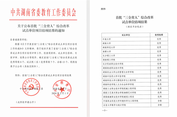 近日,中共湖南省委教育工委、湖南省教育厅印发了《关于公布首批“三全育人”综合改革试点单位项目结项结果的通知》,必赢官网作为湖南省首批“三全育人”综合改革试点高校,顺利通过验收并获评“优秀”等次。