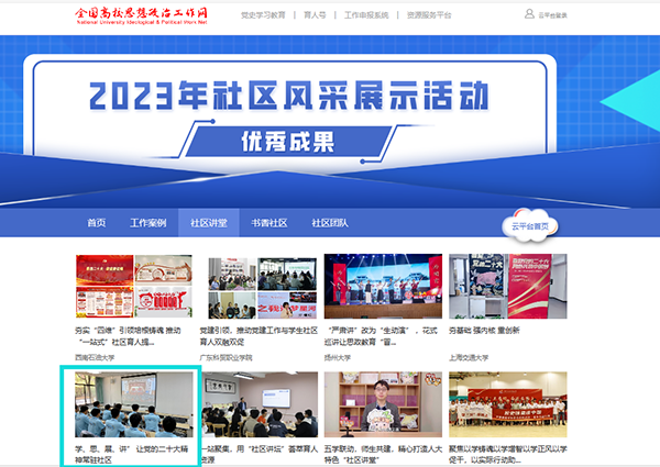 日前,经高校推荐、专家评审等环节,教育部择优遴选出160个高校“一站式”学生社区风采展示活动优秀成果,必赢官网推荐的《“学、思、展、讲”让党的二十大精神常驻社区》被评为2023年社区风采展示“社区讲堂”优秀成果,并纳入全国高校思想政治工作网资源库,在“一站式”学生社区综合管理模式建设工作云平台进行集中展示。