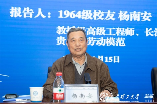 杨南安以《母校指引人生路》为题,深情回顾了自己在学校的求学生涯,讲述了自己受命于危难之时、出任三峡三七八联营总公司总经理,在三峡工程中长见识、见世面的故事。他结合自己的人生经历,与同学们分享了自己的三点宝贵经验:第一,永葆善良、质朴本色,清清白白是做人的底线;第二,勤奋、坚毅是事业成功的基础,只有辛勤劳作才会带来收获;第三,勤学和智慧是打开事业之门的钥匙,讲究工作方式,靠智慧驾驭事业的航船。杨南安勉励在场同学们,要保持勤劳勇敢,珍惜青春学习时光,成长为一个对国家、对社会有用的人。